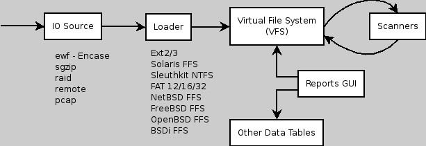 • IO SourcesLos datos forenses a menudo están en una variedad de formatos. Esta es una abstracción que permite a PyFlag gestionar varios tipos de archivos imágenes usando diferentes drivers para presentar una visión de los datos lógica y consistente.